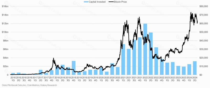 在比特币早期的几年,即2009年至2012年期间,风险投资公司对其兴趣寥寥,因此本文的分析从2012年开始。同时,还值得注意的是,比特币价格与筹资金额之间的长期关联性,这种关联性直到2023年才消散。