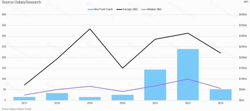 - 2023 年是自 2020 年以来新推出的加密货币风险投资基金数量最少的一年,平均基金规模下降了 30%,基金规模中位数下降了 45%。