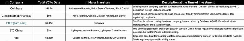 - Coinbase: 获得了最大一笔资金,由Andreessen Horowitz (a16z)、Union Square Ventures和Ribbit Capital支持。Coinbase,如今是一家上市公司,是比特币领域的关键玩家。