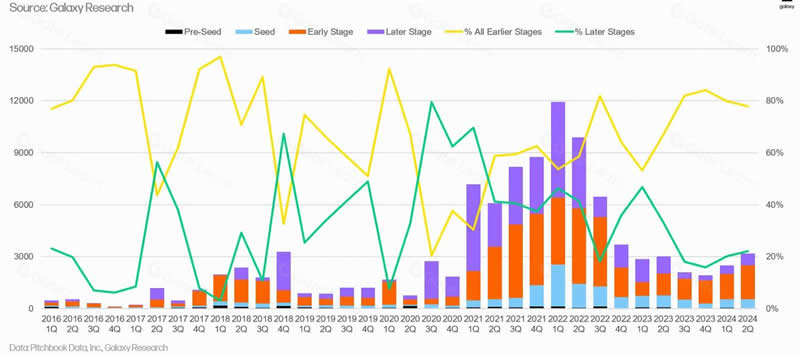 我们之前的时事通讯已详细介绍了 2024 年第一季度和第二季度风险投资的情况。我们只会强调下图中可见的内容,这是自 2021 年第一季度末以来的持续趋势,其中早期投资明显优于后期投资。