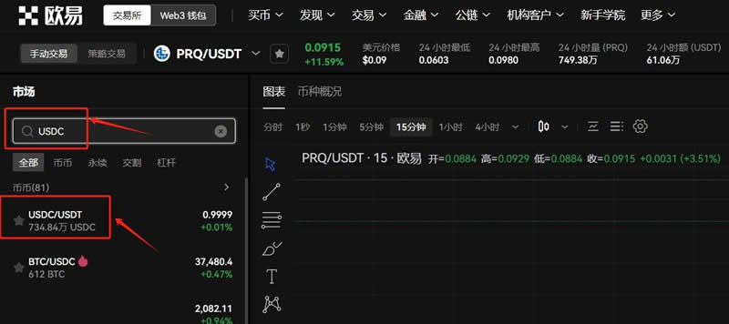 7、搜索币种简称【USDC】,选择【USDC/USDT】交易对