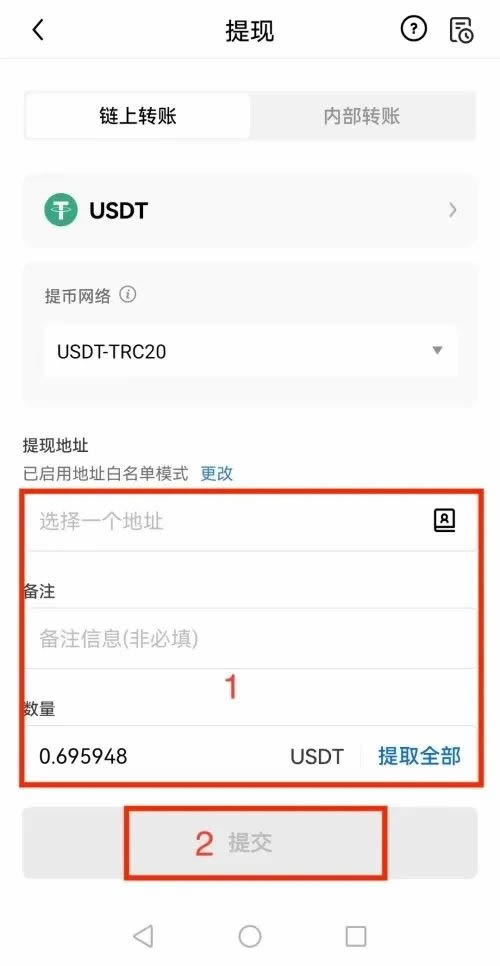 4、在提币白名单模式下,选用地址后,按提示输入【数量】—【提交】,完成提币操作。