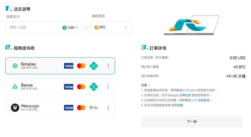 Bitget 币记(官方注册 官方下载)另外一种入金方法,是透过第三方平台,使用法定货币来购买加密货币入金,目前提供67 种法币入金,台币也包含在内。