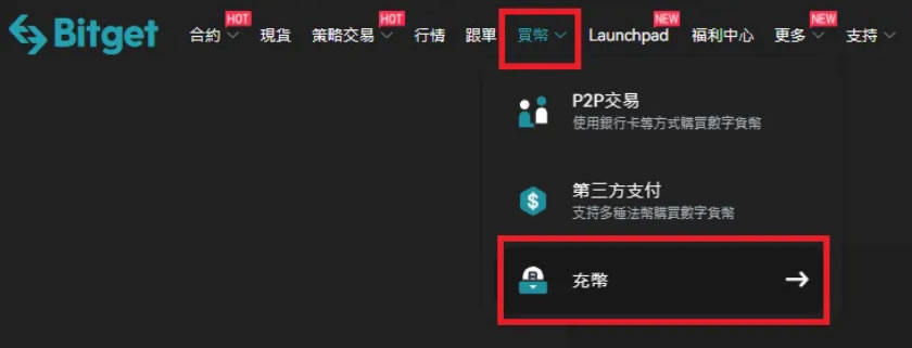 进入Bitget 币记首页,点选上排的「买币」选择「充币」;或是找到「资产」点选「充币」。