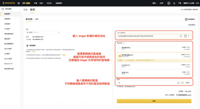 开启币安交易所,点选钱包中的「现货钱包」,到现货帐户中,针对要转帐的币种进行「提现」,并选择刚刚选定的链名称,