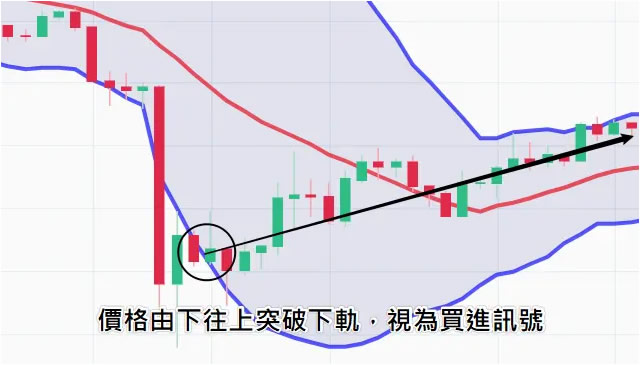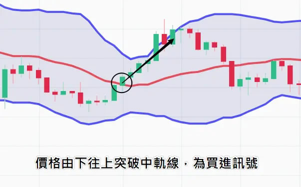 - 价格由下向上穿越中间线时,代表股价可能加速向上,是加码买进讯号