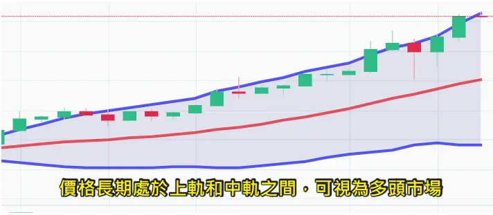 - 价格在中间线与上轨线之间波动时,为多头市场