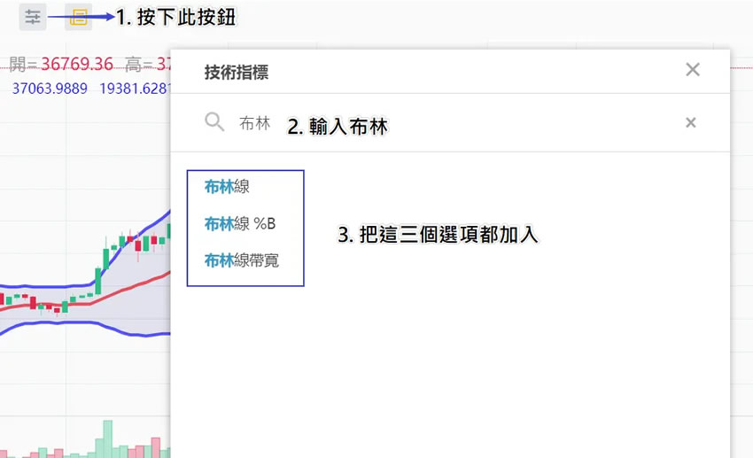 接着系统就会在下方跳出两个指标「布林带宽BBW」、「布林极限指标%B」,然后在走势图上也会显示出布林通道,