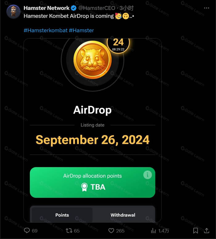 根据白皮书及官方消息,Hamster Kombat (HMSTR) 代币预计将于 2024年9月26日 正式上线,上线当日将进行有史以来最大规模的加密货币空投活动。