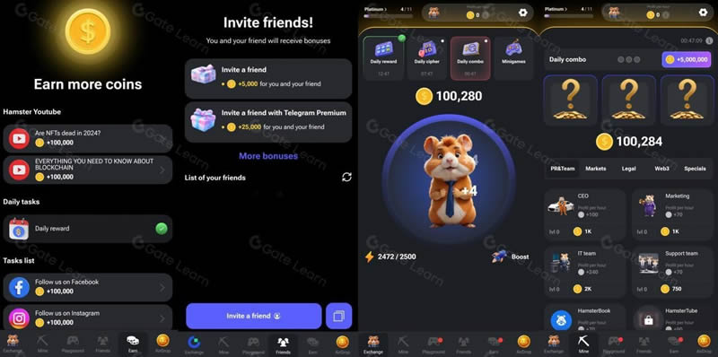 奖励机制:玩家通过参与游戏、完成每日任务、连击和密码解锁等方式,可以获得 $HMSTR 代币作为奖励,这种“边玩边赚”的机制大大增加了玩家的参与度和用户粘性。
