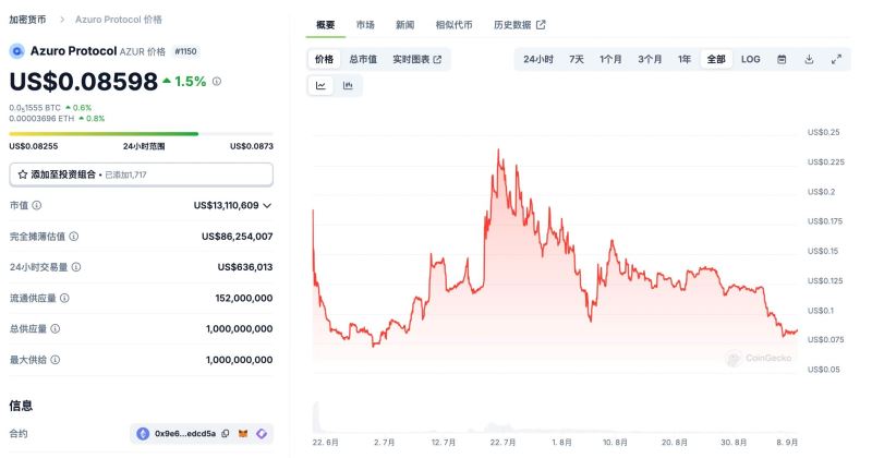 此外,Azuro 已发行代币 AZUR,据 Coingecko 数据显示,AZUR 目前价格为 0.086 美元左右,市值 1311 万美元,相较 2 个月前的高点价格 0.2396 美元已下跌超 60% 。