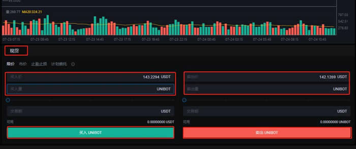 8.选择【现货】,输入买入/卖出数量,点击【买入UNIBOT】/【卖出UNIBOT】,即可完成购买和交易操作。