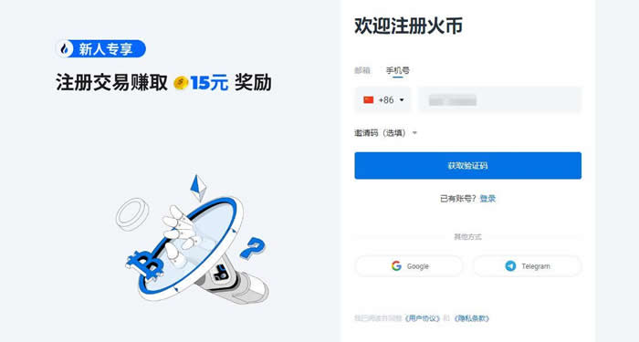 1.进入火必交易所官网(点击注册),选择【手机号】注册,输入手机号,点击【获取验证码】。