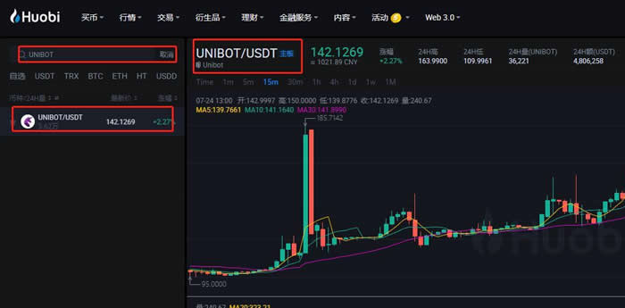 7.在左侧搜索栏输入币种简称【UNIBOT】,选择【UNIBOT/USDT】交易对