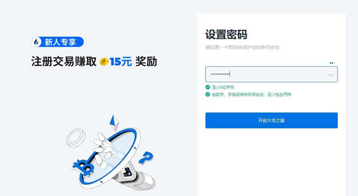 3.设置密码,点击【开启火币之旅】,即可完成账号注册。