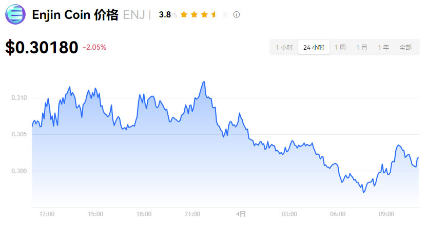 截止6 月3 日,ENJ 的交易价格为$0.3106,在过去24 小时下跌了0.02%,最低跌至$0.2928。