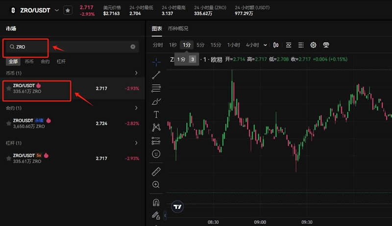 11、在搜索框输入ZRO,选择ZRO/USDT交易对,可以看到ZRO实时行情