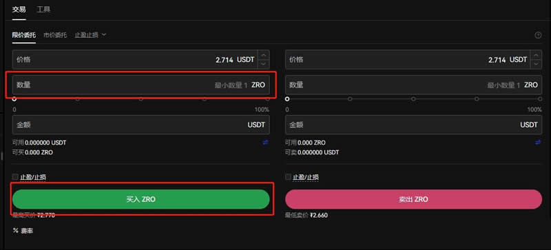 12、输入买入ZRO数量,点击买入ZRO就可以了ZRO