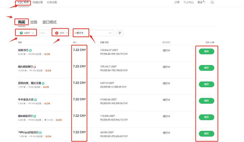 9、进行交易前需要拥有USDT,可在C2C买币进行交易,根据需求选择合适商家,点击“购买”,而后根据提示进行付款、等待商家放币(若是长时间没有收到币种,可联系客服进行处理)