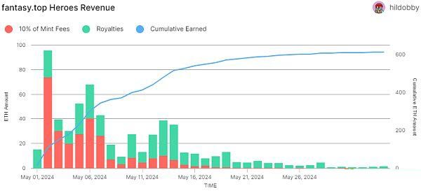 每日活跃用户在 fantasy.top 主网启动的第一天达到顶峰,此后一直呈下降趋势,导致该平台在过去一周的收入仅为几个 ETH,并大幅减少了可以奖励给网红的支出。