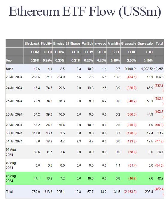 昨日以太币虽在北京时间早上一度下杀到2,111美元,不过在美股开盘之后,ETH并没有随着美股持续下杀,以太坊现货ETF反而录得了4,880万美元的净流入,为7/23上市以来的次高流量。