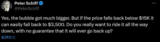 当时,Peter Schiff对此民调结果不以为然,他指出,假设微策略在此下跌过程中,没有购买更多比特币,微策略也将损失43亿美元,他还表示,比特币的泡沫已经更大,如果比特币价格回落至15,000美元以下,将会很容易进一步崩跌至3,500美元,他询问比特币坚定持有者们:你真的想一路抱着,但没有保证它能回升吗?