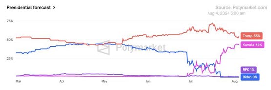 哈 里 斯在民调中对川普的支持率上升,这对加密货币市场不利。尽管民 主 党对加密货币的敌意较小,但整体股市和加密市场更倾向于支持川普获胜。