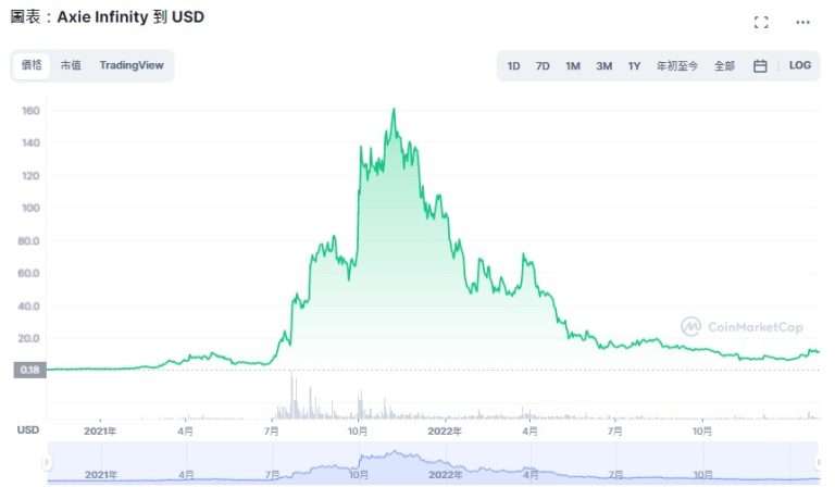 在2020 年11 月上市时,Sand币的价格约为一枚0.12 美元左右。而在2021 年,随着加密货币、区块链等元宇宙的兴起,AXS 开始以强劲势头上涨,尤其是在2021 年6 月底。 它最终从4 美元左右涨至165 美元,并在2021 年11 月创下历史新高。