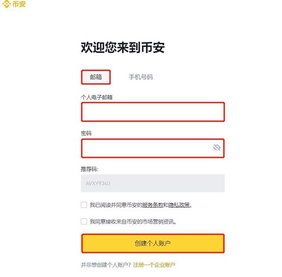 1、打开币安官网,点击页面左侧的【使用手机号或邮箱注册】