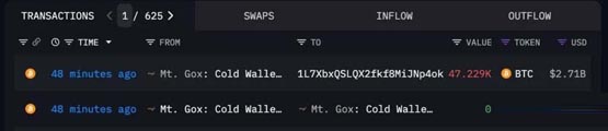 数据显示Mt. Gox 所持资金原本是被分散存放在3 个钱包内,但在大约3个小时前,其中一个冷钱包将47,228.7枚比特币(价值约27.1 亿美元)发送到以「1L7Xb」开头的地址。