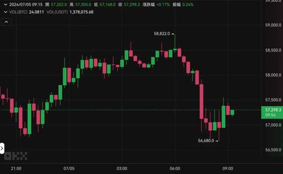 或受此影响,比特币在相同时间最低插针至56,680 美元,非常接近5 月1 日创下的前低56,552 美元。撰稿当下,比特币回弹至57,298 美元,近24 小时下跌4.89%。