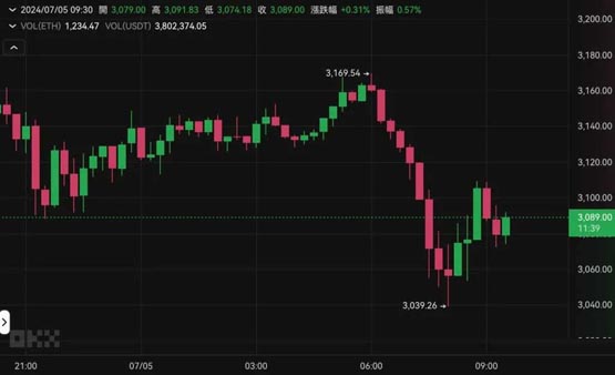 以太坊部分,波动较比特币又来的更高一些,稍早最低插针3,039 美元。撰稿当下回弹至3,089 美元,近24 小时下跌5.43%。