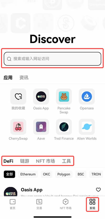 以App为例,用户可在搜索框或DeFi、链游、NFT市场、工具四大排行榜中基于链筛选并查看各式Dapp,点击即可跳转。如需使用某一Dapp,连接钱包即可使用。也可以将频繁使用的Dapp点击【】添加至【我的收藏】,方便查找。