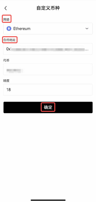 如果无法直接搜索到币种名称或合约地址,点击【添加自定义币种】,选择对应的【网络】,输入【合约地址】,点击【确认】完成添加。