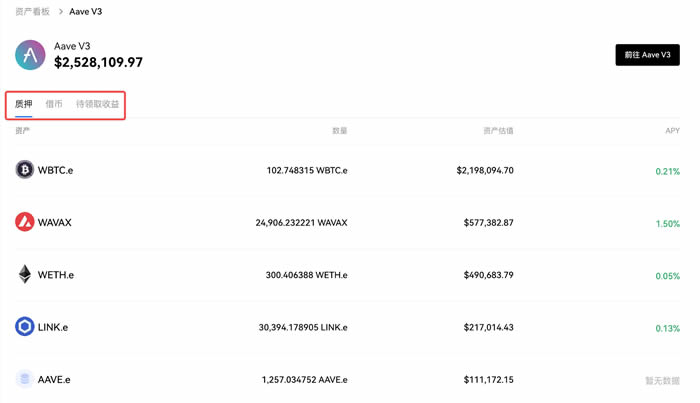 用户可以在【DeFi】看板界面,查看某一地址参与的不同DeFi协议、质押、借币以及收益情况。
