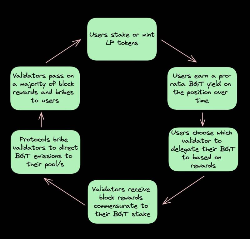 PoL是一种新颖的奖励机制,用于对齐用户、dApps和验证者。简而言之,用户持有/铸币 LP 代币并赚取 BGT,这些 BGT 可委托给验证者,验证者可获得与其 BGT 股份相称的区块奖励。因此,安全性直接与流动性挂钩。更具体地,请参考:
