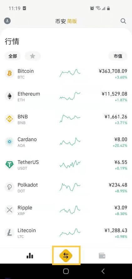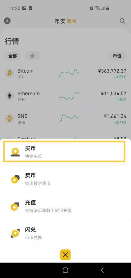 6.在币安简版首页,点击底部的交易按钮,点击“买币”。