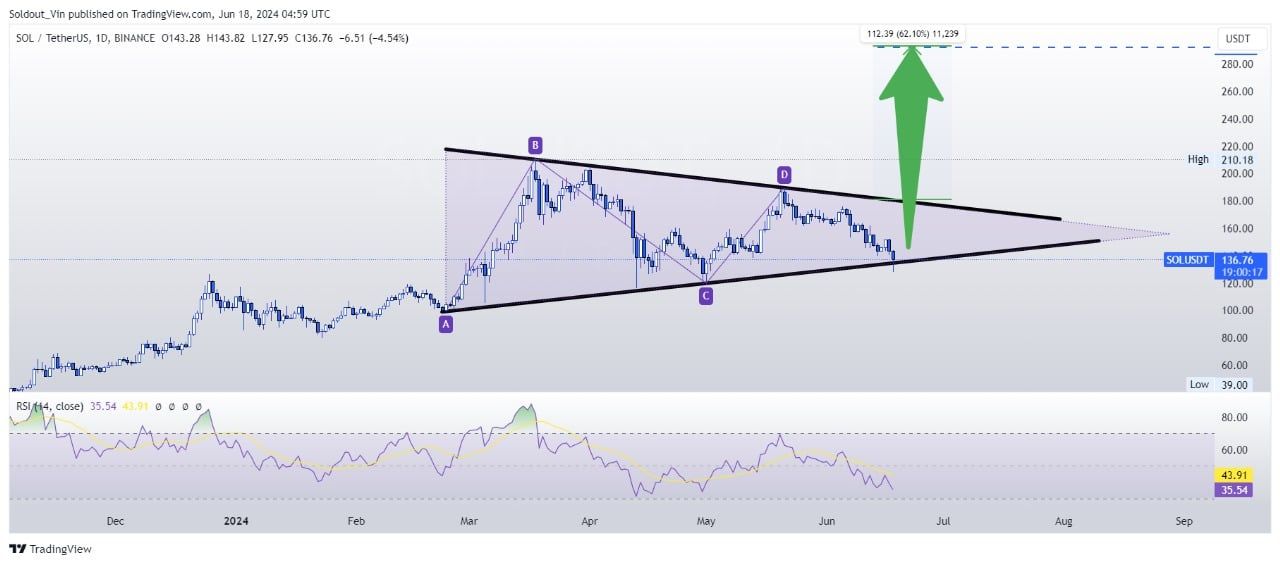 SOL 价格此前一直呈对称三角形趋势。这种市场结构可以朝任一方向发展,但受到一定影响,则更有可能朝特定方向发展。Solana 之前的趋势是向上的,这可能是决定对称三角形如何发展的主要因素。