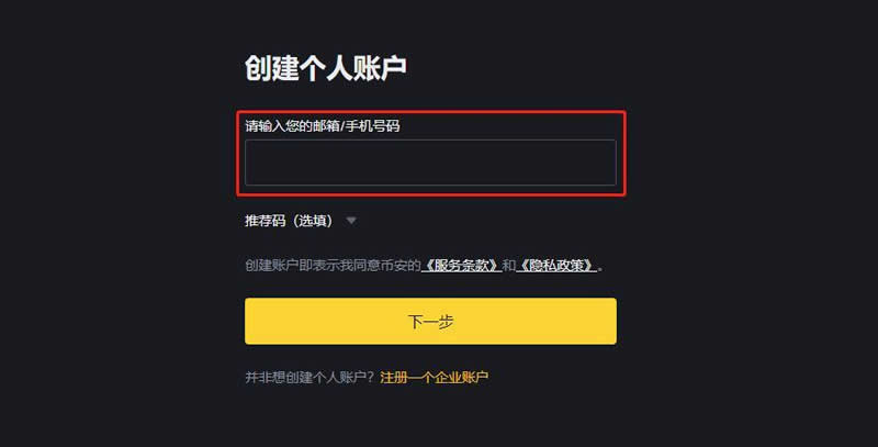 2、币安已全面开放大陆用户进行手机号注册,输入邮箱/手机号,点击下一步即可