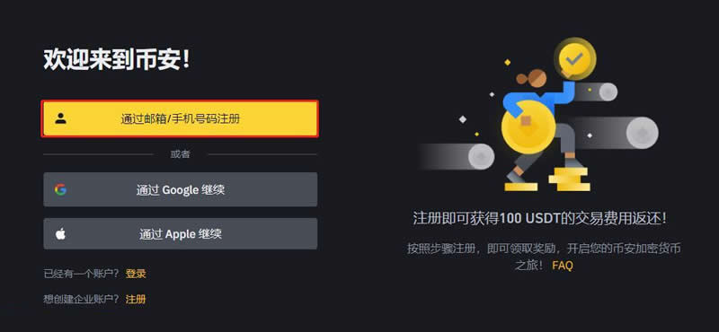 1、打开币安官网(点击注册),点击左侧的【使用邮箱/手机号注册】