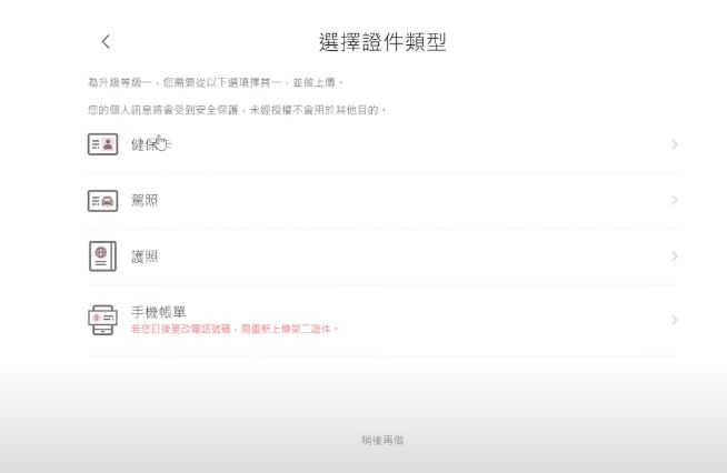 step 4:完成第二证件认证。 MaiCoin 帐户注册采双证件认证,你可以选择保健卡、驾照、护照及手机帐单作为第二证件,因此,在申办时务必注意将证件都准备好。