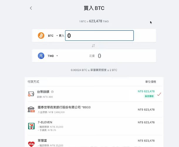 购买加密货币时,首先MaiCoin 会给出报价,让您知道当前的即时买价。接着,您可以选择用帐户里的稳定币如USDT 或USDC 支付,或者选择使用新台币支付。