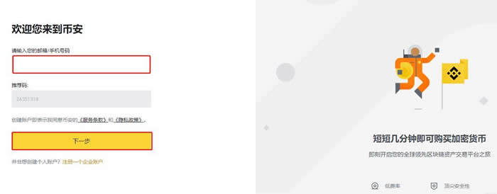 2、币安已全面开放大陆用户进行手机号注册,输入手机号、点击下一步即可。