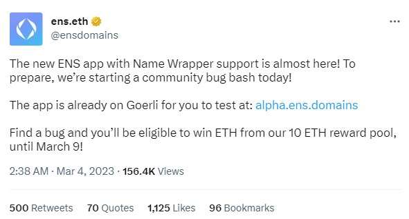 2023 年3 月初,ENS 宣布将推出新版应用程式,除了跟旧版相比使用体验更加优良外,还支援域名封装器(name wrapper) 功能。当前新版可于Goerli 测试网使用,官方还提供了10ETH 的漏洞赏金。