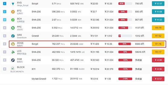 以2023年价格为例,当前狗狗币价格为0.061543美元,一度电价格为0.3元,矿机成本10000元,算力为782.237 TH/s计算,每日产值11.425元,日电费10.26元,收益为1.16元。