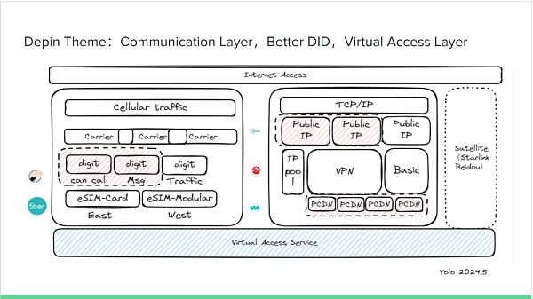 由于部分Depin设备在物理世界存在,与传统商业社会相关,而Crypto世界以PermissionLess 为特征,因此如何在没有KYC的情况下,对各类参与主体进行事中管理便尤为重要。我们认为整个web3世界需要一个通讯抽象层,整合蜂窝网络和公网IP网络,用户/设备只需缴纳Crypto货币 就能获取对应的网络服务。具体的方向赛道有:
