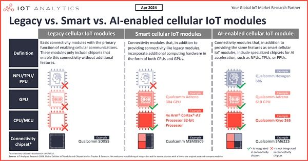 智能蜂窝物联网模组:除了像传统模块一样提供连接功能外,还以中央处理器和图形处理器(CPU 和 GPU)的形式集成了额外的计算硬件。