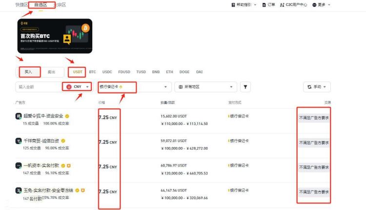 6、在进行现货交易前需要获得USDT,可在“一键买币”——“自选区”——“买入”获得,注意法币需要选择CNY,然后根据需求选择交易商家