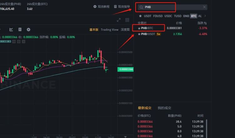 8、搜索币种简称【PHB】,选择【PHB/USDT】交易对