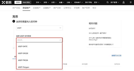 3、选择USDT充币网络,可以根据需要选择不同网络,但要注意提币网络需要和充币网络一致,不然可能会造成资产损失